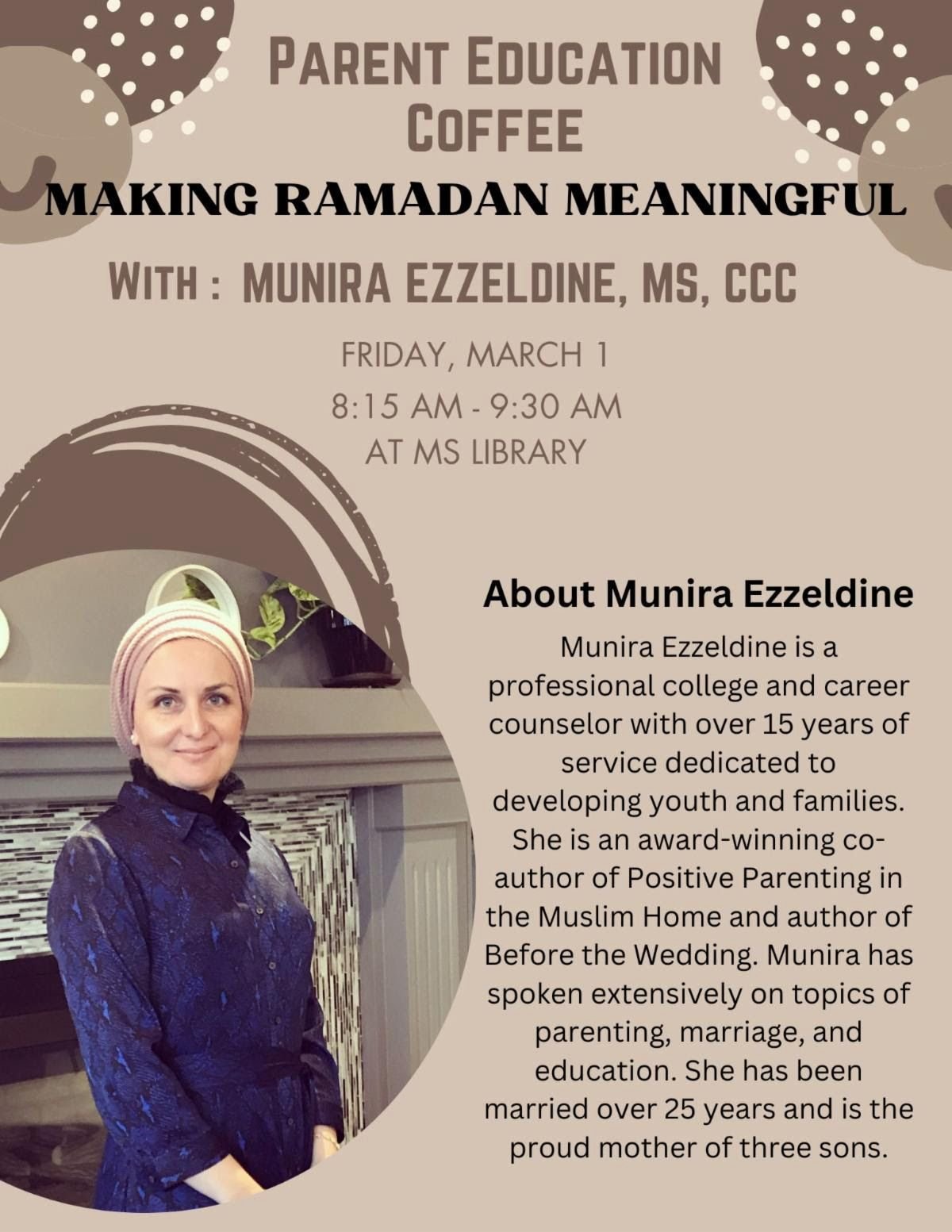 Munira Ezzeldine is a professional college and career counselor with over 15 years of service dedicated to developing youth and families. She is an award-winning co-author of Positive Parenting in the Muslim Home and author of Before the Wedding Munira has spoken extensively on topics of parenting, marriage, and education. She has been married over 25 years and is the proud mother of three sons.